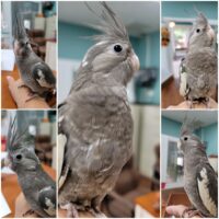 White face cockatiel that is mostly grey. She has some white spots on the back of her head.
