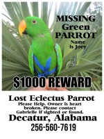 Joey flew away in the SW Decatur area in Alabama Sunday afternoon. He was last seen at Larkwood DR SW. He can talk, sing, laugh and whatnot. $1000 reward upon his safe return or sighting that leads to return.