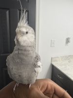 He chirps when he flies. Hes a silver cockatiel with a white face. he can say step up , and hey boiby. he is a