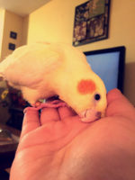 Peep has an Orange band on his right foot and has a little vertical black line on his head behind his crest. Band: AZ JRS xxx