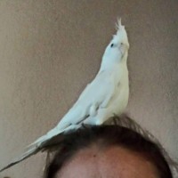 Buddy is super sweet and prefers to sit on my head rather than my shoulder. He is albino so there are no distinctive markings. He is not aggressive but will call your bluff if he doesn’t want to be picked up. He is probably terrified but ? may respond to “wanna com-ere?” He prefers my company to another’s, he does love people and will not bite.