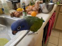 SueƱo is about 23, I’ve had him for 18 years. He’s never been outside without a carrier. He’s a good flyer. He sometimes wolf whistles, might say hello, but usually not for strangers.