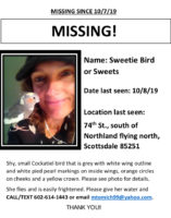 I have been canvassing my neighborhood from Scottsdale rd to Miller rd and Camelback to Chaparral to find her. I heard her call several times and she was spotted three times Mon and Tues. I can no longer hear her and I think she may have flown north of Chaparral and/or east of the canal. She often fllies in a loop or boomerang pattern