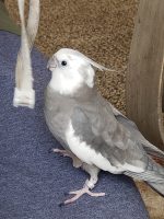 If you yell his name, he usually responds with two syllable scream. He does not have trimmed wings. Around 10 inches, skinnier and little smaller than a dove. Band on right leg. Is comfortable with socks and shoes.