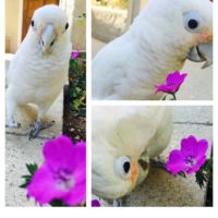 She is a very intelligent bird and is very good at escaping. She squawks in the mornings and evenings. She has a slight crooked beak that grows more towards one side and responds to her name. She is tame but selective to who she goes with.