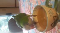 Oscar is an 18 year old quaker parrot. He chews his feathers a little in the chest area. He is green with grey cheeks and bib around chest with blue wing tips and some blue under his tail. He is very shy with strangers, but talks with me. He can fly. This bird is my baby. I have had him over half of my life. He has a band on one leg with TX 5.. I will provide a reward for anyone who finds him. Please call me at 775-790-3424 if you see him. Don’t try to get him out of a tree because he will probably scare and fly away again. Thanks for your help!!!