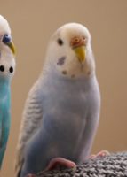 Bird has mostly white wings with very light blue chest. Has an injured beak. Last seen in Baltimore Court, Chino.