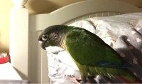 Flew away on April 11 in the morning. It’s a small green cheek conure. It can say it’s name “kiwi” and “poopy”