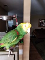 Large Double Yellow Amazon , Quite but can talk knows his name and says hello and a few tricks, Reward / Willing to buy him back.