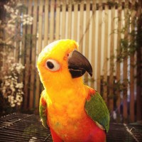 No band, but her wings are clipped. She is shy, but very cuddly. She has never flown before now, not even in the house, so she is not skilled. She loves seeds and pony tail holders more than pretty much anything ever. She steps up like a champ, and she likes to snuggle in blankets.