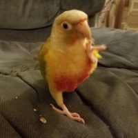 Our baby is a small friendly bird, fully flighted and unclipped. He likes to fly to people’s shoulders to get their attention. He knows his favorite treats by name: he loves orange juice and cashews.