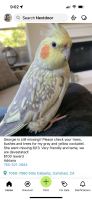 Georgie is a tame, friendly gray and yellow female cockatiel. She is three years old and has all her flight feathers. She loves people and my fly to your shoulder. She loves Cheerios and may be persuaded with millet sprig or Cheerios.