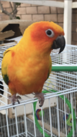 It is a sun conure. It is chubby and flies slowly. Color is orange, yellow, green, and blue.