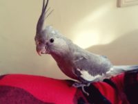 She is a female gray-white faced cockatiel. She makes high pitch sounds when she is hungry,scared or when she hears whistles. She also responds to her name ‘Totoro’. She is very friendly and sometimes shy but if you have food out she will climb onto you. She is hand-tamed/fed. She has a purple band around her leg.