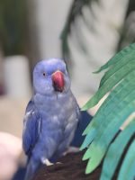 DJ is a hand-fed Indian Ringneck parrot missing since Feb 25, 2026. Extremely human-bonded and not experienced outdoors. Blue/Violet body, red beak, long tail feathers. Responds to “DJ” “Give me