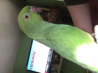 James is a small Indian ringneck. He is green, has a dark beak and is about 6-7 months old. He is not rammed and will get scared easily. Was last seen in west Los Angeles near University Senior high school. If seen please contact me at jeniferkm38@ gmail.com. Thank you.