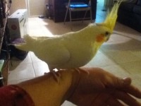 Well, she is a cockatiel, yellow face, pinkish beak and feet, missing one of her nails on her right foot. She has a bald spot where her crest is (it’s that tall yellow patch of feathers she has on her head). She is mainly white other than the yellow face and orange circle patches on her ears.