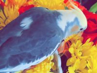 Noodle is a female cockatiel, with a yellow plume, grey and white feathers. She responds to “chicken noodle” or to the sound of a bag of seed/food rattling. She’s a young bird who just started to molt.
