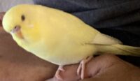 friendly, says a few words, will respond to being called baby bird or baby girl. Has a blue spot on lower back area. Love’s spray millet & her greens. Snap finger for her to come to you, will land on finger. She will say peek a boo & give me a kiss. Light yellow & while color.