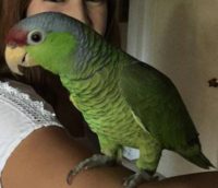 Very friendly- if you say “step up” he’ll go on your wrist- just don’t put your fingers near him he is scared of fingers. He can whistle the chargers theme song and if you ask him to give you a kiss he will make a kissing noise. He flew away out an open door near Green Elementary School in San Diego on Tuesday, July 25th around 4pm