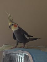 Friendly male gray cockatiel. Yellow face, orange cheeks. 15 years old. Will step up on hands and responds to whistles.