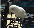 Albino budgie with green leg band. Bright blue chest, white feathers. Very friendly. Black eyes. About 6 months old.