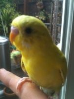 Buddy is almost all yellow with green on her belly and tail feathers. She is very tame.