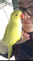 he still doesnt have a ring on his neck yet, he is solid yellow. he has a blue band on one of his legs, its chewed up so it looks kind of silvery. his eyes dilate and he will snap if he gets scared