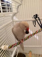 White, red beak, nail recently trimmed, female bird. About 6 year old. She does have a band but it is very hard to read what’s on there. I don’t have the information.