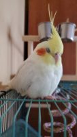 He has a bald spot on his head and a little crack-line on his beak. He kinda knows how to sing the Mickey Mouse March so if you whistle it to him he can only do the rhythm of the song. He’s friendly and loves to perch on shoulders and heads. This is his first time flying outside of the house so he is very curious and flew high and far.