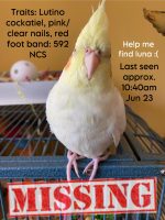please help me find luna 🙁 she has pink nails, bald spot on crest, and is a pretty big cockatiel