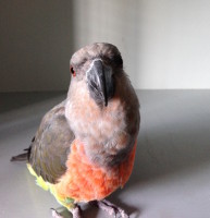 Grey outer feathers with orange breast feathers. A little timid but somewhat friendly. Will perch on your finger. Responds to his name. Able to fly now.