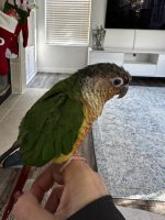 Green cheek conure. She is 11 months old. She is green, red and yellow with a red tail and blue wings.