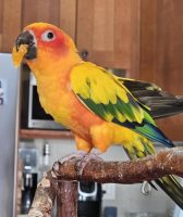 Chicky has a crooked wing and sounds a bit more squeaky than an average sun conure. Does not like hands but very docile. Does not like to be handled.
