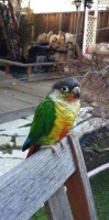 She has a red band on her left foot (if you’re facing her), she was adopted from PetsMart, she is a very vocal green cheek and can say “step up.”