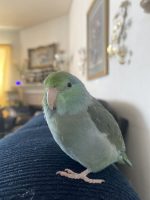 Very small parrotlet may be hard to spot since she may be hiding in the trees. She is a green shade not very bright but she’s a light shaded green. Her front / belly looks a little light blue.