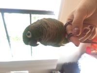 She is very friendly and squeaks very loud and high pitched when you call her name. She has a black beak and is green with some blue feathers and a red tail feather. She doesnt know how to fly very well, so she gets hurt often trying to land. We love her very much so if you have any information, please contact asap.