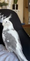 Leo is a female white and grey cockatiel she is around a year old. She is very shy but very friendly and sweet, she will be skittish when approached but once she steps up to your hand she will be very sweet, doesn’t bite unless she is very upset. She is very mellow, responds to certain sounds and whistles. My kids miss her very much, she is a very dear pet.