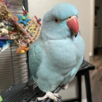 Blue Indian Ringneck escaped during a wind storm – she answers to “where’s my baby bird?” “Give me a kiss” /smooches and various whistles. Friendly towards dogs.