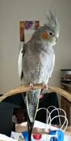 Sunny is a very Friendly Gray and white Cockatiel with yellow highlights on her head and orange cheeks.