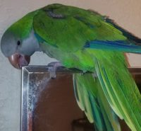 Tico is a mainly green Quaker Parrot. He has arthritis in o e of his back perch toes. It takes him a bit to get his foot to perch right. He’s very social, but also a very nervous bird. He has a vast vocabulary..very talkative. Laughs when he’s nervous or scared. Loves to snuggle, and be close, and he will tell you that. He loves apples, and associates them with “night night” ” let’s go bed” He loves yo sing pretty bird, purple rain, and good morning to you. We rescued Tico, and his Conure “sister” from a bad situation several years ago. His sister is very codependent on Tico, and is a mess right now. We miss Tico terribly.