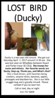 Green and yellow conure escaped at parker and whedbee she knows her name and loves to talk. One rear toe points off to the side.