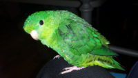 Green lineolated parakeet. Responds to Midori. Is banded on her right leg starting with LLP. I will supply complete band information.