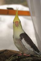 Yellow, gray, and white Cockatiel with yellow cheek patches. She also has a deformed toe that is curved upwards. She was fully flighted at the time she escaped.