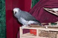 20 years old. Says night night, calls for my dog Laser, are you alright, makes alarm sound, dripping water, doorbell. Likes peanuts and fruit loops. Likes to take showers. His name is Jackpot