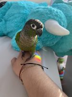 His band bracelet is purple, his wings are fully grown, his belly has some red feathers, his tail is red.