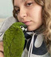 He is a green hanhs macaw. If you tell him to come and repeat it he will come. Please help me look for my baby. He is a young hanhs macaw, some of his wings were cut but they are still a little long. He has a leg band.