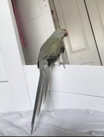 She is an Indian Ringneck and a recovering plucker so her feathers on her chest looks off color than her other feathers colors.