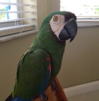 His name is Oz. He is mostly green and has orange eyes. He says words like Papa, Gabriel, Isabella, What are you doing, good bird, etc. He bites people that he does not know.
