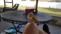 Wings clipped. Not a great flyer. Knows kisses and love you. Friendly. Beak a little scarred due to old injury. Knows name.